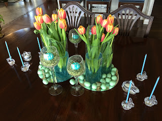 Still, the tablescape display called out for more. I tried the glass candle holders in varying sizes. I filled the candle bowls with spring peas – usually used for split pea soup – and nestled the blue floating candles on top of the peas.