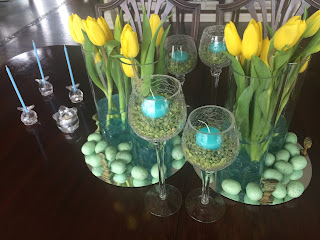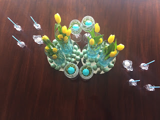 I filled the bottom of the tall vases with cut blue decorative glass.